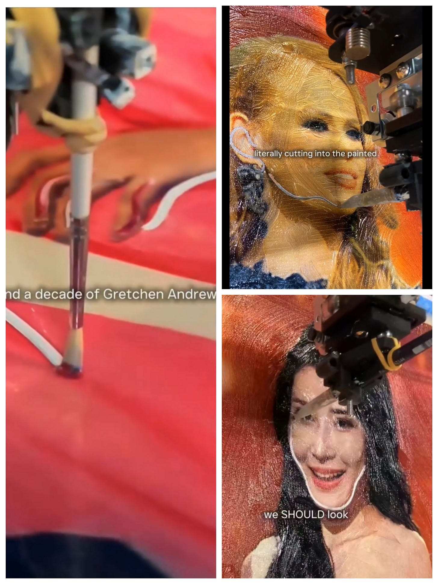 بدايةً رُسمن كما هن بملامحهن الفريدة، وتنوعهن المميَز و المميِز. ثم تدخلت الخوارزمية بفرشاة آلية عبر ذراع روبوت بُرمج ليرسم مبيّناً حدود معايير الجمال الموحدة عالمياً في الآونة الأخيرة، و التي تُستخدم كفلتر تجميل رقمي لتعديل أو كما يُقال تحسين صورنا بشكل شبه يومي في العديد من التطبيقات.