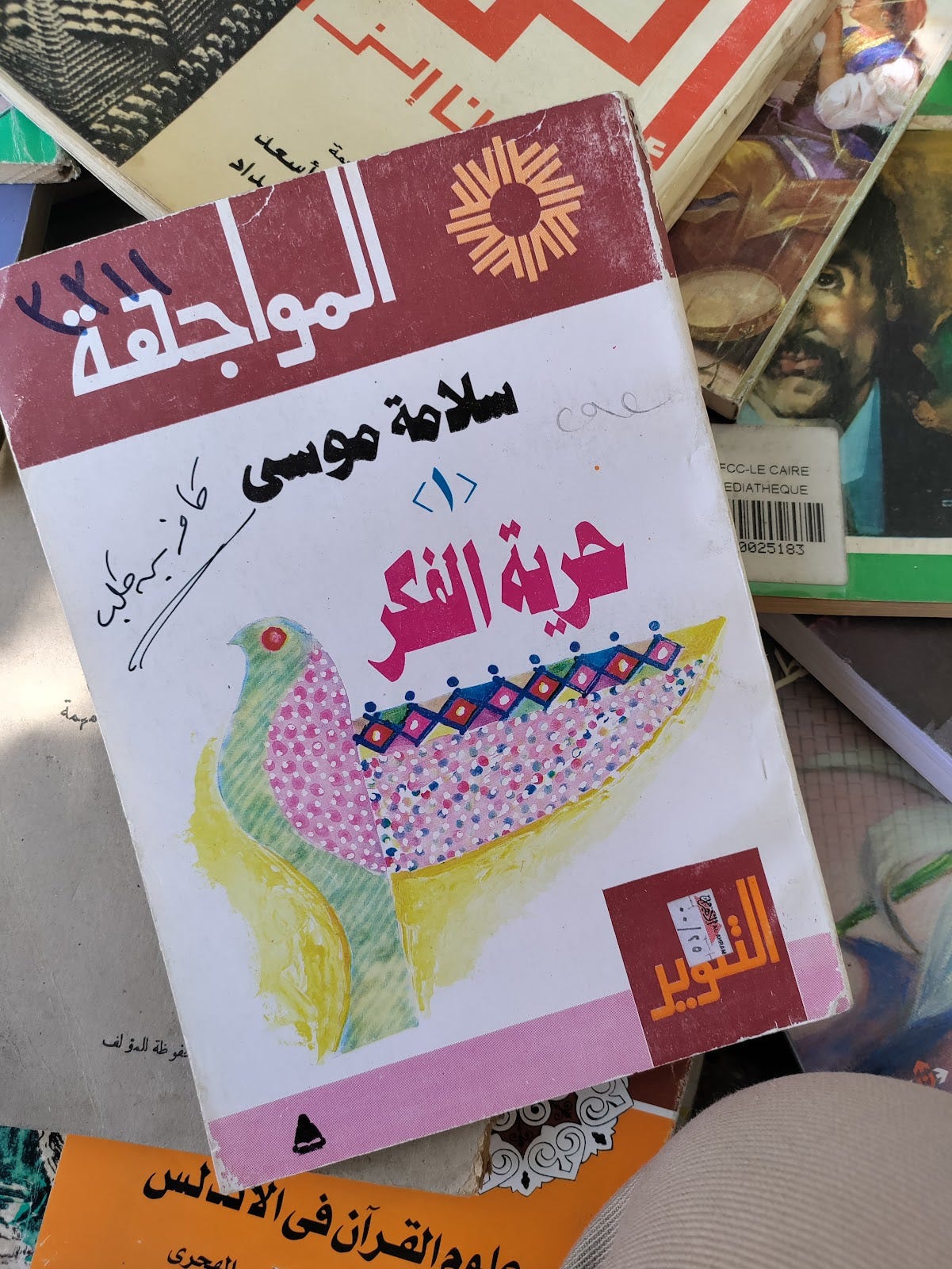 (دعوة سلامة موسى لحرية الفكر لاقت صداها بصورة مميزة عند أحد القراء والذي أخذ على عاتقه تحذير الأجيال القادمة بعبارة موجزة حادة يبدو فيها العداء الواضح بعد تخلصه طبعا من الكتاب والذي انتهى ذليلا بائسا على بسطة كتب عشوائية، المثير في الصورة أيضا لفظ “بن” بين كافر وكلب، في العادة مع النطق تبدو الألف في ابن واضحة مؤكدا عليها لكن القارئ هنا اختار الصيغة العربية الفصحى، أين عفوية الغضب ؟ هل هي العادة ؟ أم هدوء من يصدر حكما نافذا في غير انفعال ؟ - الصورة من التقاطي)