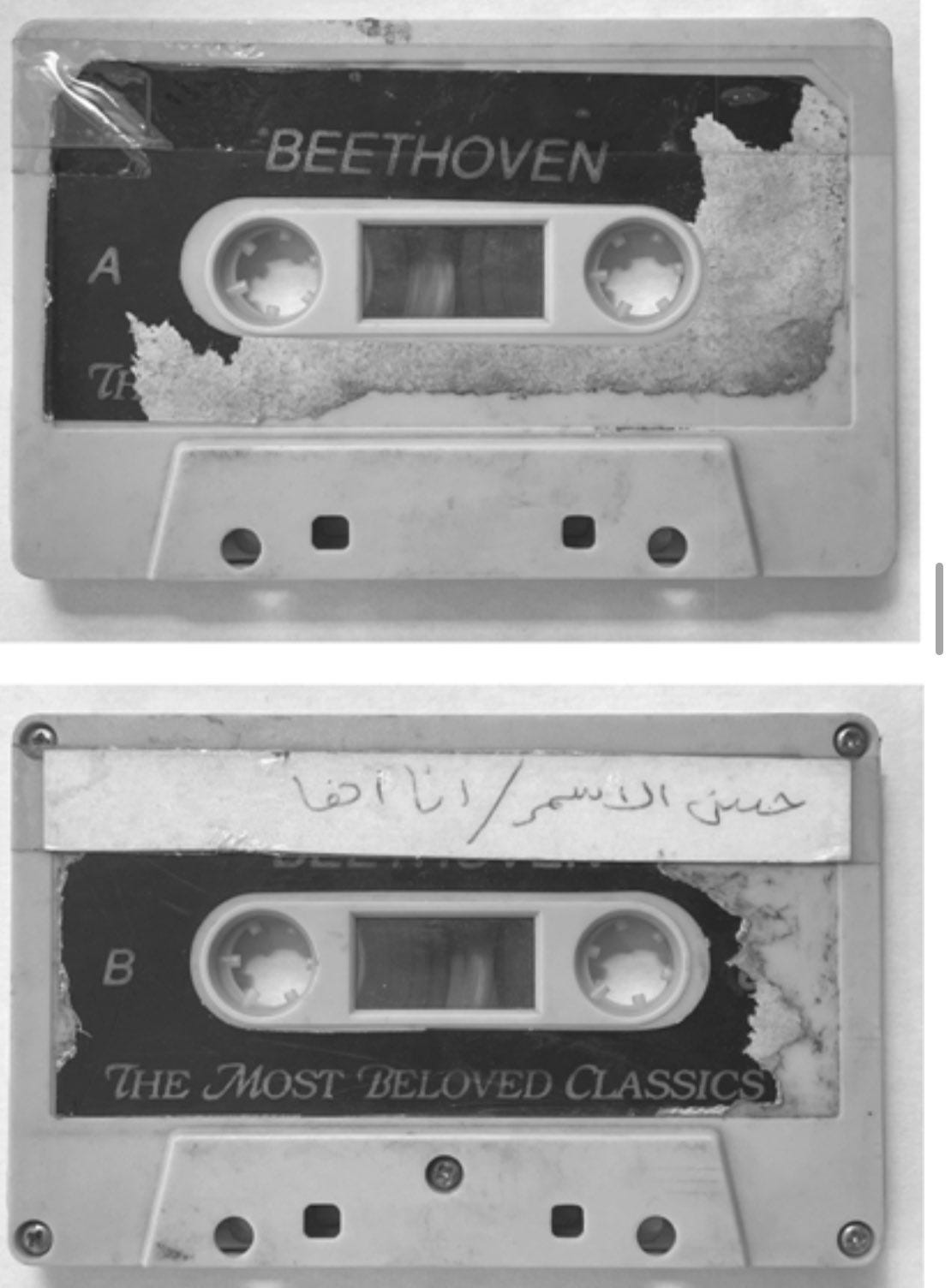 أثارت هذا المعنى ايضا، أعني التحولات المثيرة للأشياء في خلال تاريخها، في ذهني ما اعتبره أجمل صور الكتاب بلا منازع وهي الصورة التي تعرض شريط كاسيت على وجه منه مكتوب بوضوح بيتهوفن وعلى الوجه الآخر مكتوب في أسفله الموسيقى الكلاسيكية الأكثر شعبية وفي أعلاه ورقة بيضاء ملصقة مكتوب عليها “حسن الأسمر/ أنا اها” تلخص الصورة الكتاب كله، ففي قلب بكرات هذا الشريط كان يرقد المرحوم بيتهوفن شهيد الكلاسيكية ورمزها الكبير ثم جاء حسن الأسمر ليطرده منها بوضوح ويزيحه بكل جرأة وخفة قائلا كما المكتوب أنا أهوه، وانت أهوه يا عم بيتهوفن مطرودا ذليلا.