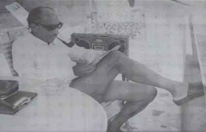 (صورة تصلح بعنوان السادات مستكنيصا على الشط، متمزجا بسماع الكاسيت وتدخين البايب ويبقى السؤال الام يسمع يا تُرى ؟ وهي من تصوير فاروق إبراهيم مستلة من الحوار التالي مع أندرو سيمون مؤلف كتاب إعلام الجماهير