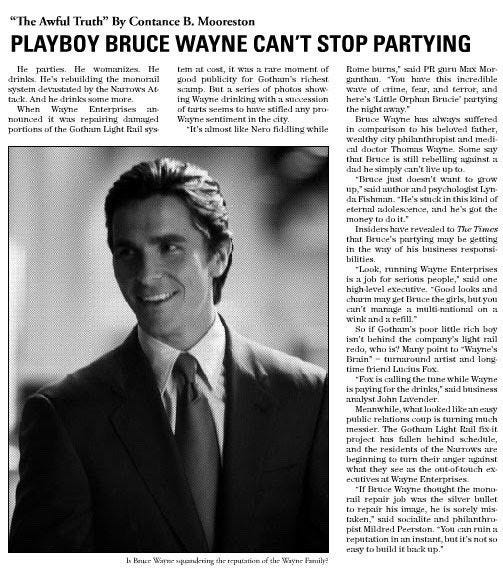 يقاتل باتمان الأعراض الظاهرية لتدهور المدينة -المجرم على مستوى الشارع street-level criminal- بينما يحافظ على عدم المساواة الهيكلية التي تولدها جوثام بإيمان راسخ، يجسدها على الحقيقة باتمان ذاته حين ينزع قناعه ويرتدي بزته الأنيقة في الصباح ليباشر دوره كملياردير لعوب يمتلك شركة واين المالكة لمعظم أصول المدينة. الكود الاخلاقي لباتمان هو بدوره قناع أدائي كقناع الوطواط، قناع يسمح له بممارسة العنف باسم حفظ النظام -بالمعنيين لكلمة نظام- دون علاج الأزمة الرأسمالية التي تؤدي لنقص العدالة.