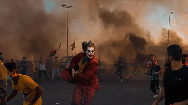 لم يكن أسفلت ساحة التحرير في بغداد في خريف 2019 مجرد ساحة اضطراب سياسي؛ بل كان بمثابة لوحة لنوع جديد من الانفجار الديني. وسط أعمدة الغاز المسيل للدموع وصوت قنابلها. بدأ شبح إلكتروني في دعم الأحداث بسلوك غريب، أحمد شوقي مصمم عراقي شاب أطلق سلسلة من الصور المعدلة لنسخة خواكين فينيكس من الجوكر تظهر في الشوارع مشاركة في حركة تشرين الاحتجاجية الملطخة بالدماء. لم يكن هذا الأمر مجرد هوس سينمائي عادي، بل حمل في طياته إشارة بصرية هامة إلى أن العقد الاجتماعي في دول ما بعد الاستعمار التي بدأت تحولها النيوليبرالي لم يتمزق فحسب، بل تحول إلى هلوسات تفترس أصحابها.